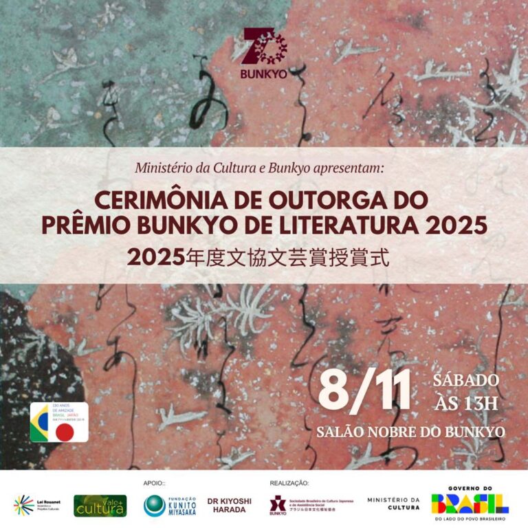 A Comissão de Artes Literárias do Bunkyo realizará no dia 8 de novembro a partir das 13h30, a cerimônia de outorga dos diplomas do Prêmio Bunkyo de Literatura 2025, que este ano completa a sua 55ª edição. Trata-se de uma homenagem aos Premiados que passam pelo crivo de um júri renomado para esta