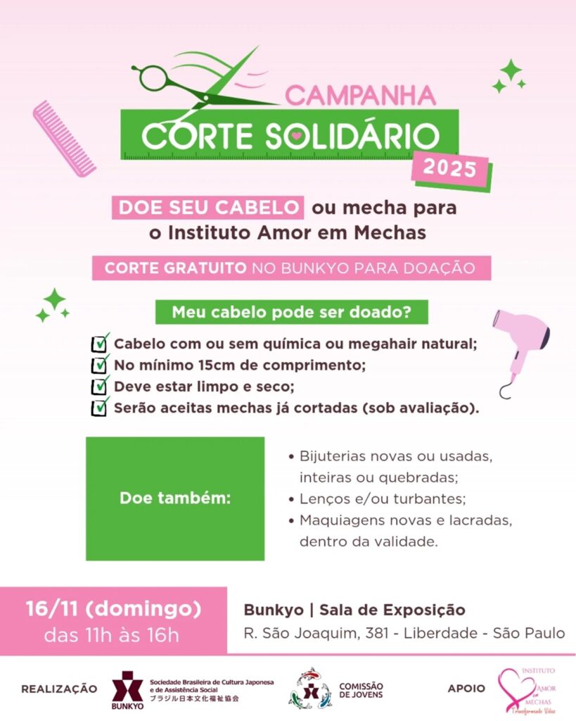 O evento será aberto ao público e ocorrerá na Sala de Exposição do Bunkyo (R. São Joaquim, 381 – Liberdade – SP), no dia 16 de novembro de 2025 (domingo), das 11h às 16h. A mecha de cabelo deverá ter no mínimo 15cm, o corte será realizado por um cabeleireiro e o doador receberá um certificado da boa ação.