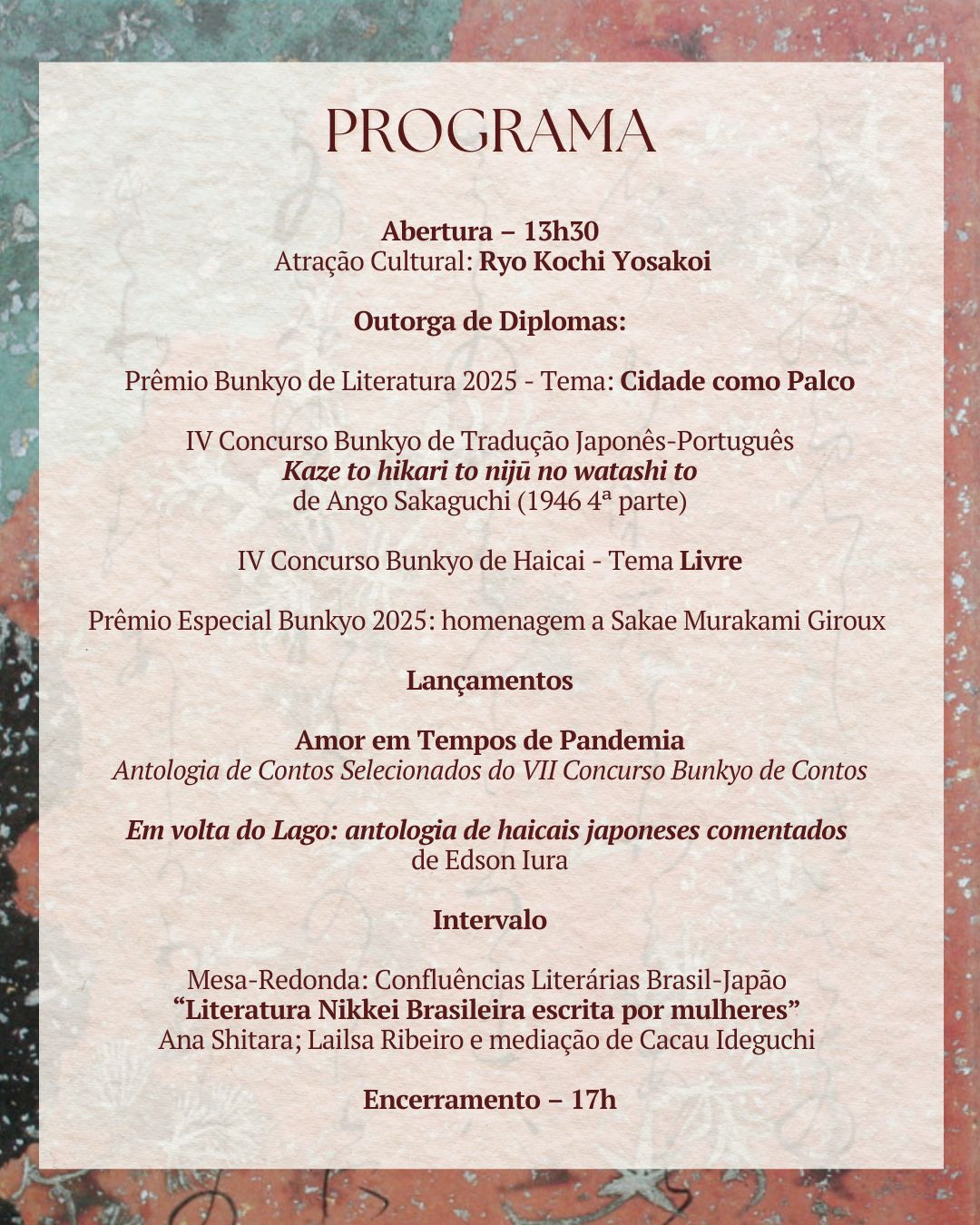 A Comissão de Artes Literárias do Bunkyo realizará no dia 8 de novembro a partir das 13h30, a cerimônia de outorga dos diplomas do Prêmio Bunkyo de Literatura 2025, que este ano completa a sua 55ª edição.