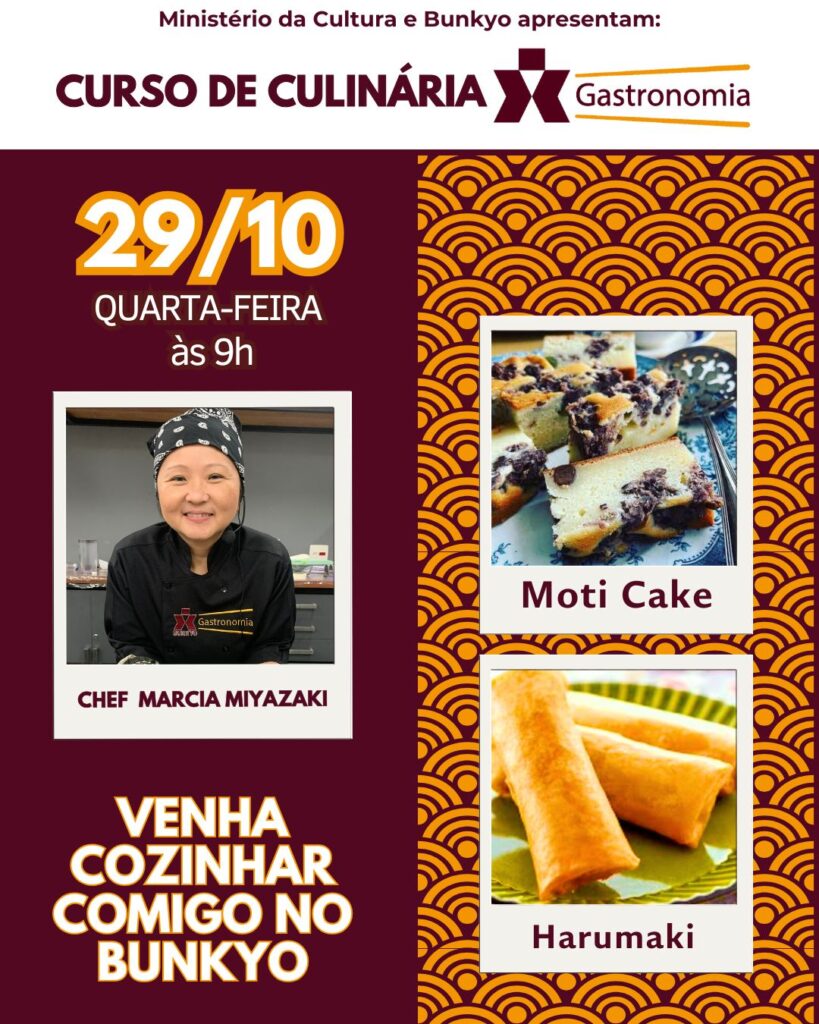 A comissão de gastronomia japonesa promove o próximo curso com a chef Marcia Miyazaki, no dia 29 de outubro (quarta-feira), das 9h às 12h, ensinando receitas deliciosas da culinária japonesa: