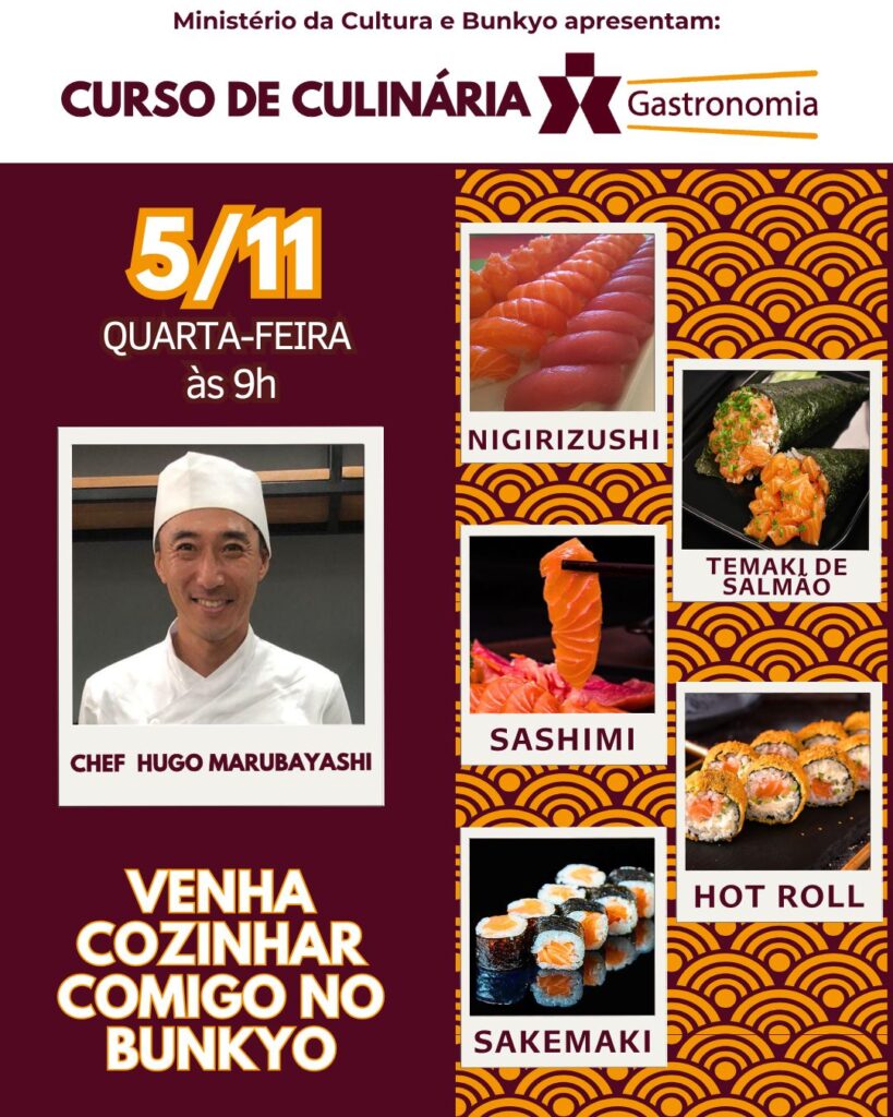 A comissão de gastronomia japonesa promove o próximo curso com o chef Hugo Marubayashi, no dia 5 de novembro (quarta-feira), das 9h às 12h, ensinando receitas deliciosas da culinária japonesa irá preparar um menu especial de Sushi: Shari (arroz de sushi), Molho Sú (Tempero para arroz de sushi), Hot Roll, Temaki de Salmão, Sakemaki, Niguirizushi e Sashimi. Aula Gratuita, com degustação no final.