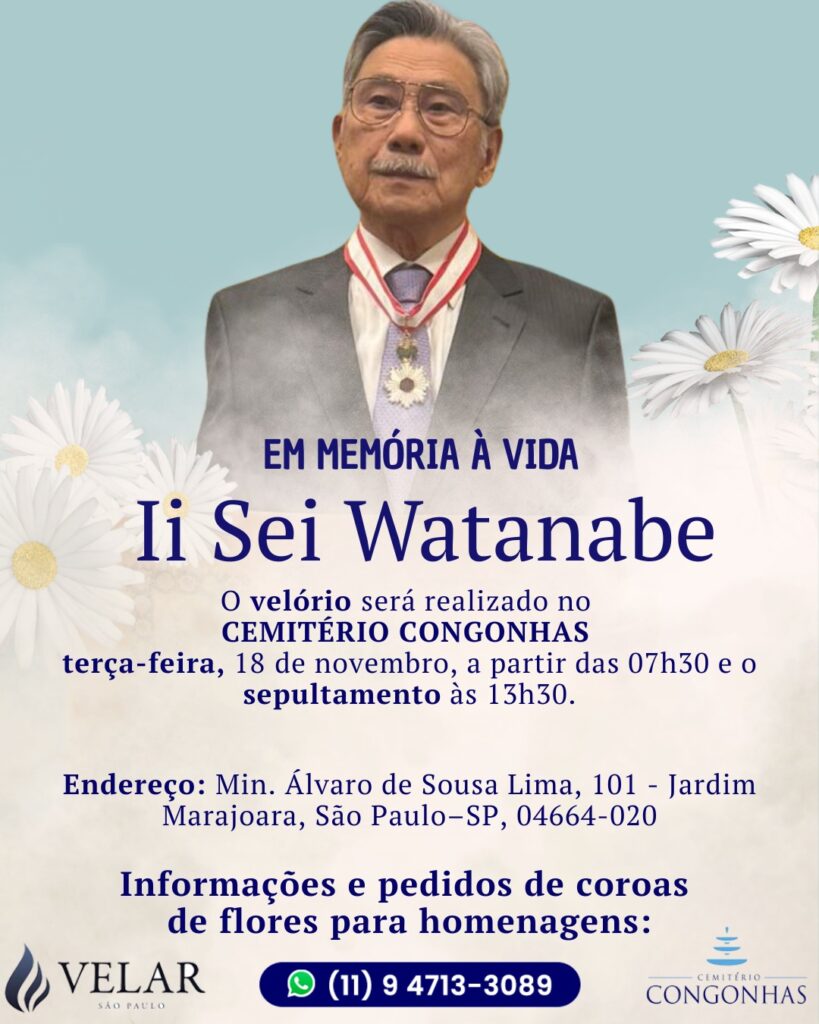 Faleceu, neste dia 17 de novembro, o Prof. Dr. Ii-Sei Watanabe, aos 81 anos de idade. Era casado com Kiyomi, tinha dois filhos, Gilberto e Marcos e dois netos. O velório será realizado no cemitério Congonhas na terça-feira, 18 de novembro, a partir das 7h30 e o sepultamento às 13h30. Endereço: Min. Álvaro de Sousa Lima, 101 – Jardim Marajoara, São Paulo/SP.