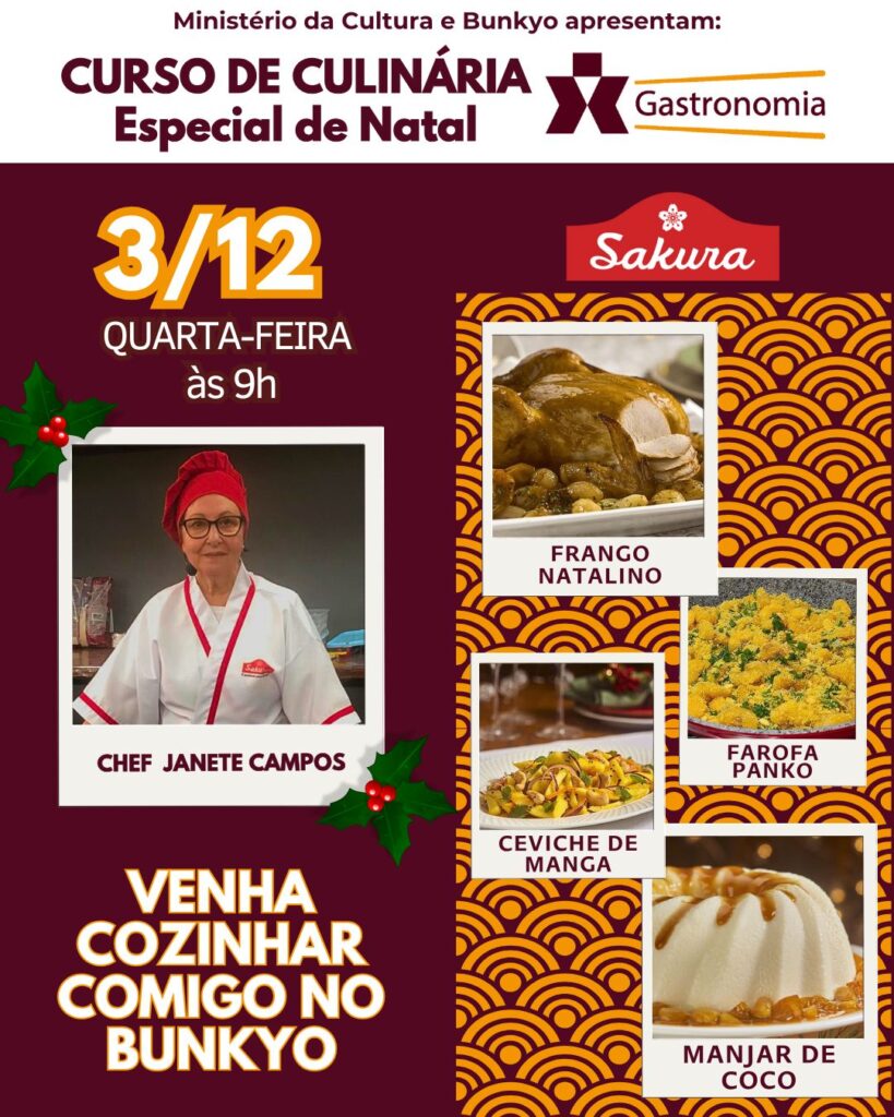 Com oferecimento da Sakura Alimentos para a Gastronomia do Bunkyo a chef Janete Campos, no dia 3 de dezembro (quarta-feira), das 9h às 12h irá preparar um menu especial de natal: