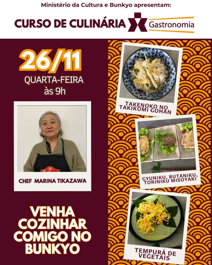 A comissão de gastronomia japonesa promove o próximo curso com a chef Marina Tikazawa, no dia 26 de novembro (quarta-feira), das 9h às 12h, ensinando receitas deliciosas da culinária japonesa: