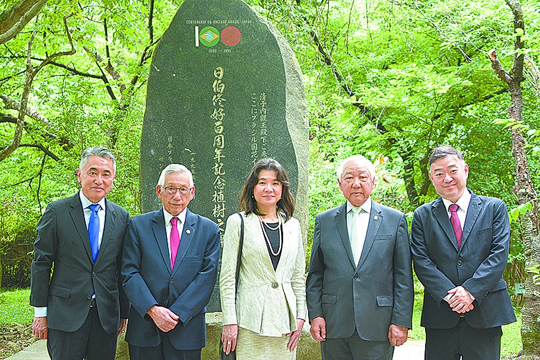 Foto 1 por: Aldo Higuchi – A Cônsul-Geral Suzuki e a diretoria do Bunkyo em frente ao marco comemorativo anos 100 aos do Tratado de Amizade Brasil-Japão.