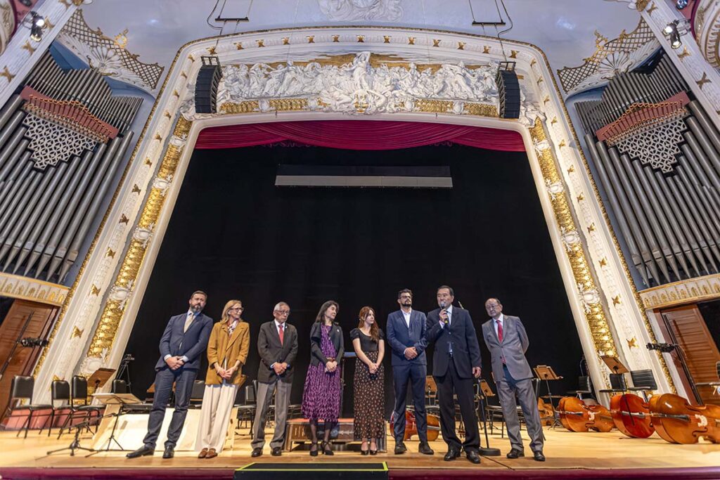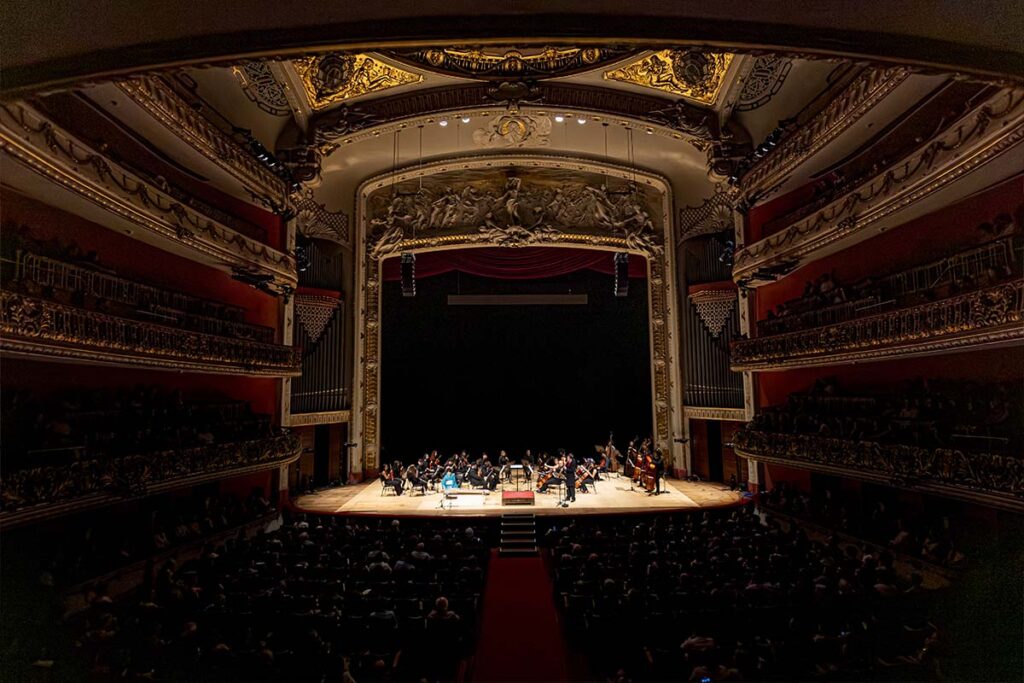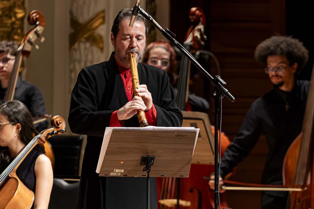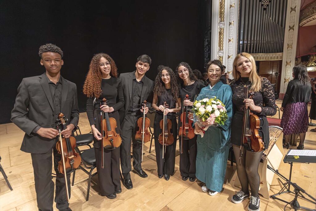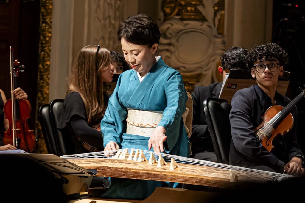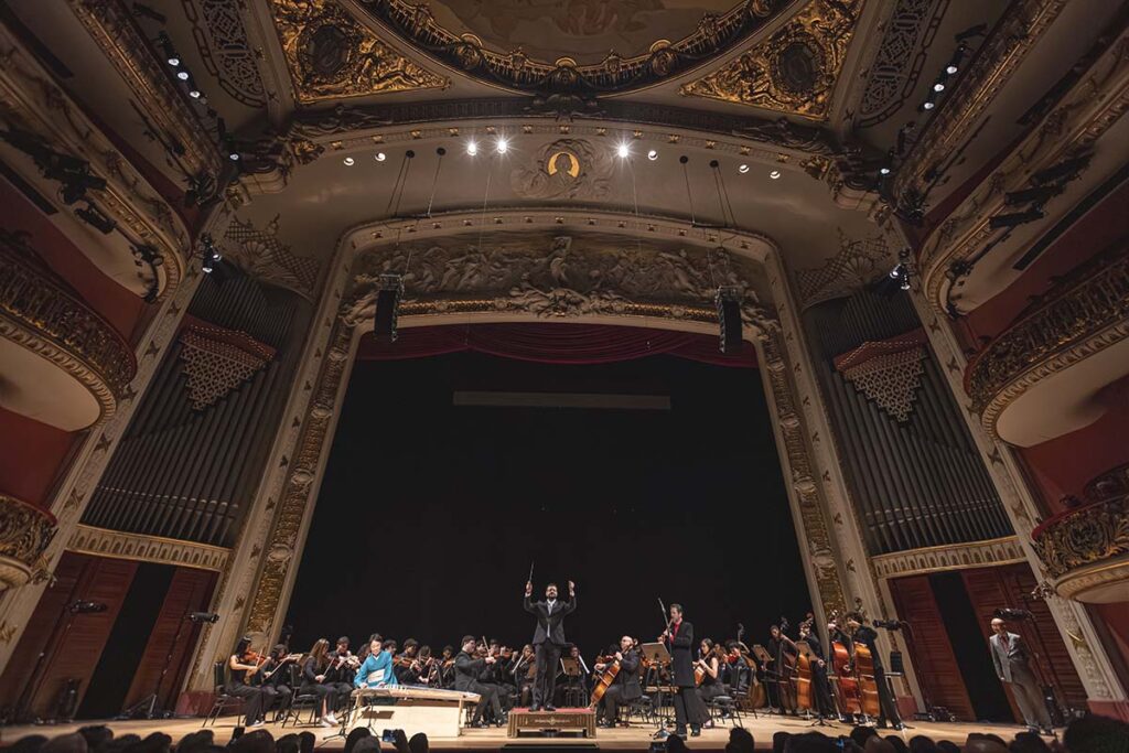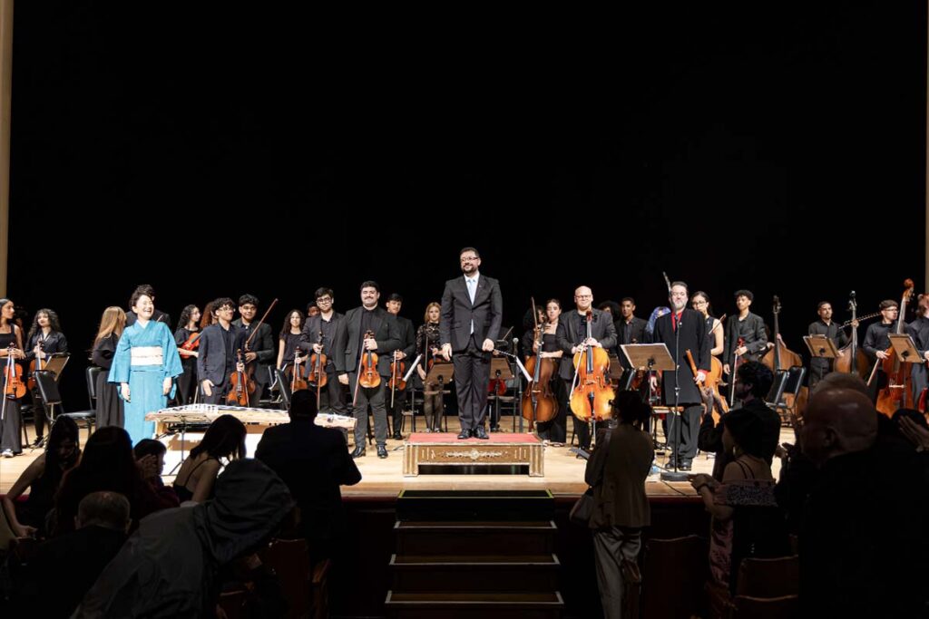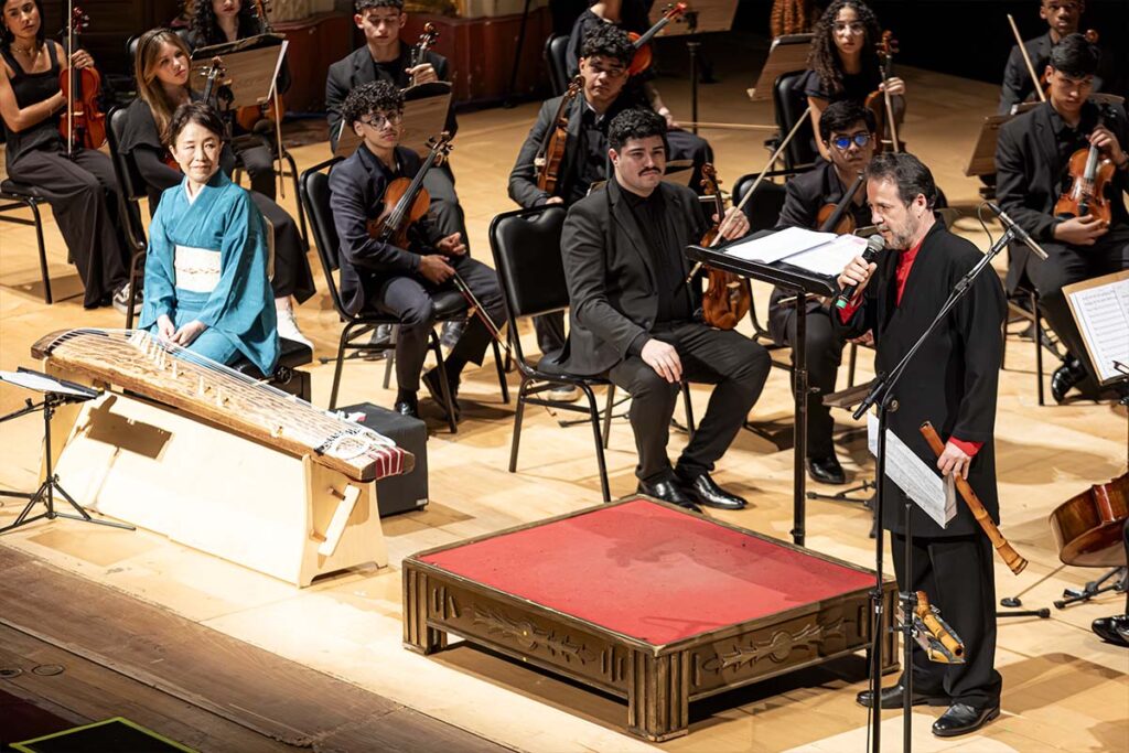 No palco, a Orquestra Sinfônica Jovem Municipal, sob a regência de Thiago Tavares, com os solistas Shen Ribeiro (shakuhachi) e Yoko Nishi (koto).