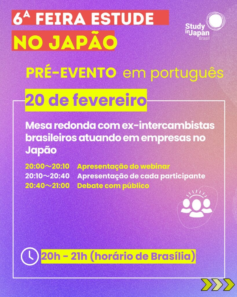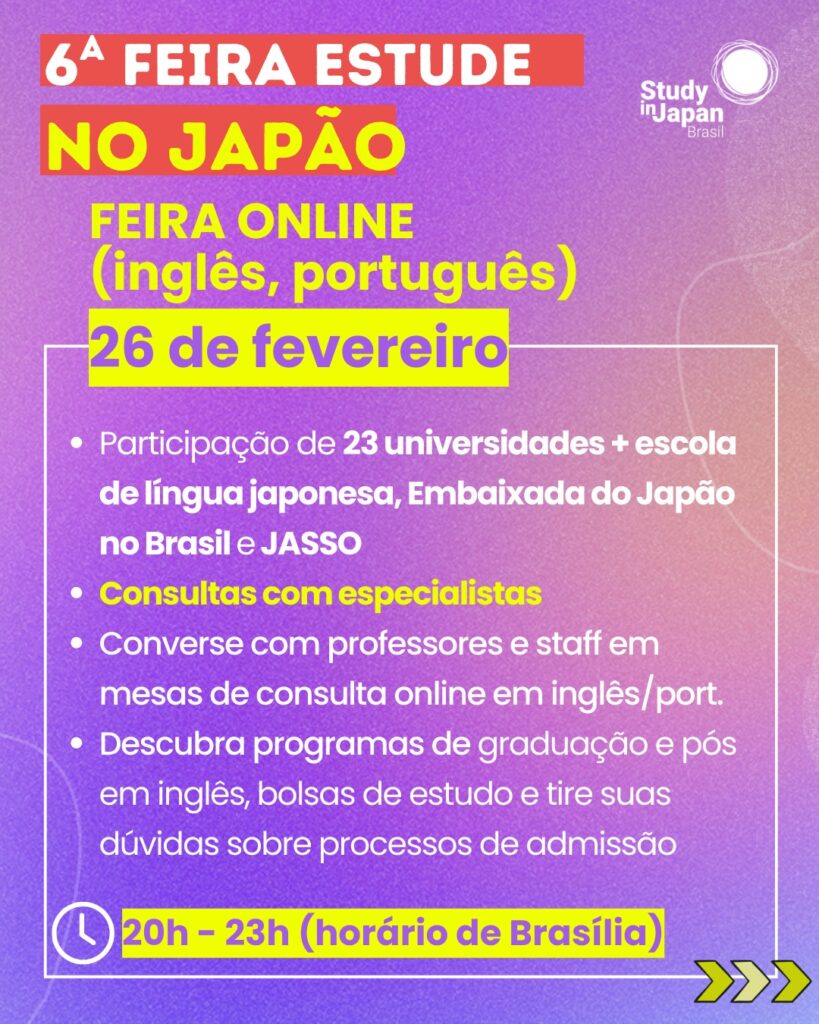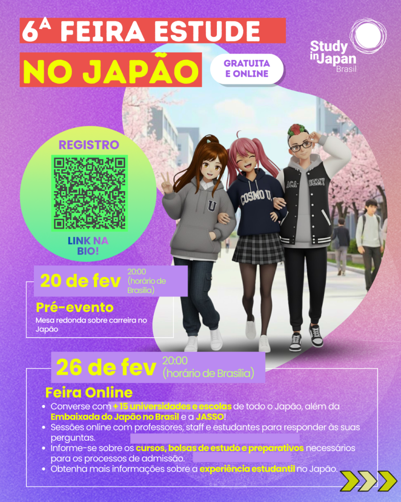 O programa “Study in Japan” realiza a “6a Feira Study in Japan Online” voltada aos interessados brasileiros. O evento será realizado em duas etapas. A primeira será no próximo dia 20 de fevereiro (sexta-feira), a partir de 20h, com a “Webinar sobre carreira no Japão com ex-intercambistas”.