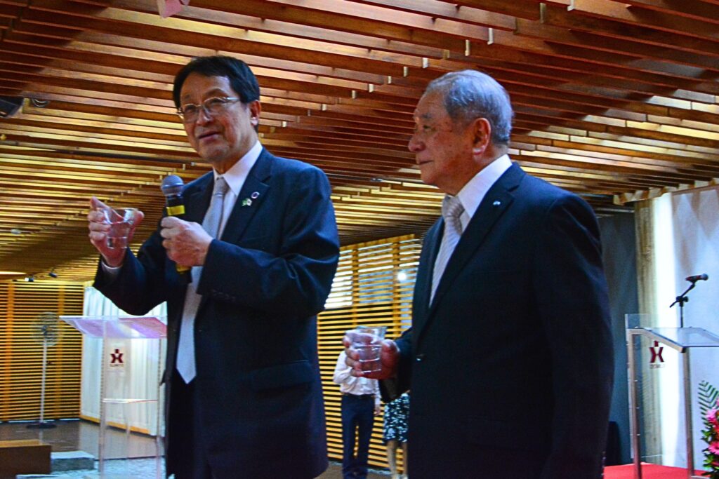 Momento do kampai: reitor Nagata e Dr. Ninomiya