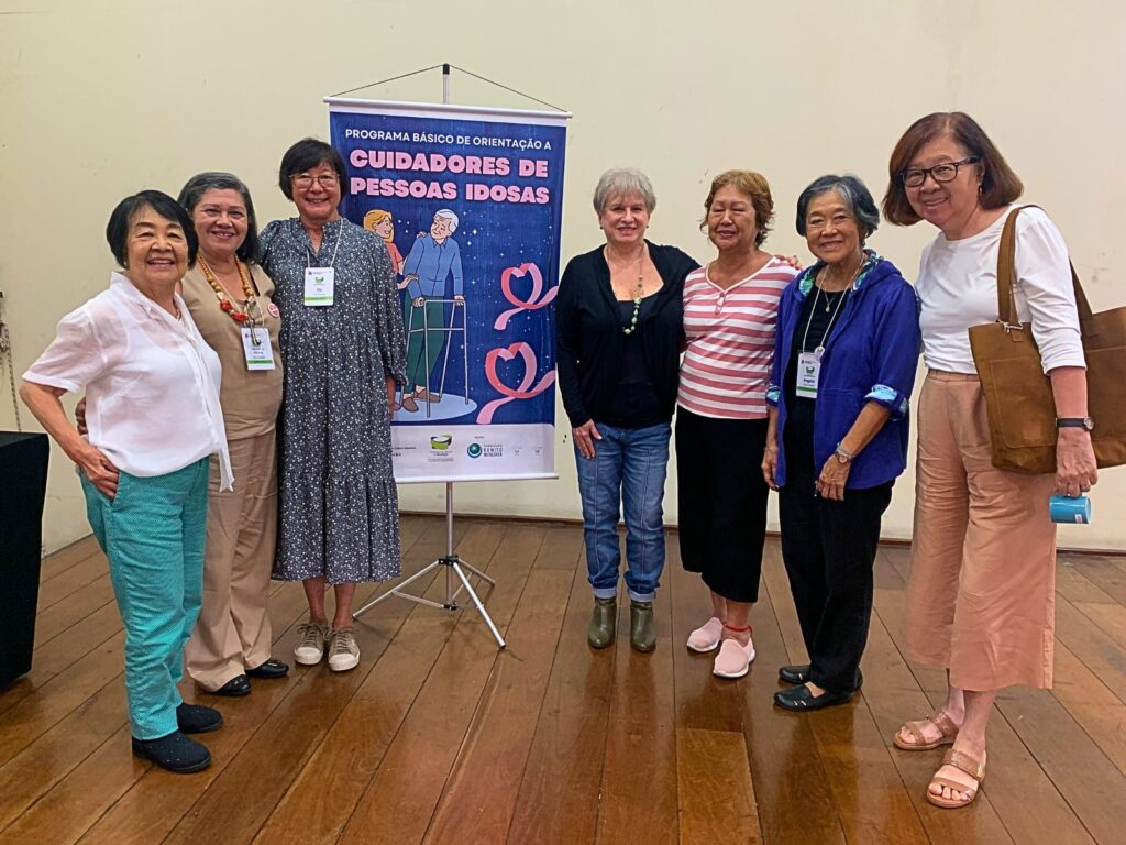 Da esq. para dir. Presidente da comissão de assistência social Zilah Daijó, Maria Fatima Oliveira, Ely Watai Kurihara, professora panorama do envelhecimento no Brasil Sandra Regina Gomes, Tereza Fumiko Iha, coordenadora do programa básico de orientação a cuidadores de pessoas idosas Maria Angela Watanabe Shimizu e Sumiko Oki Shimono