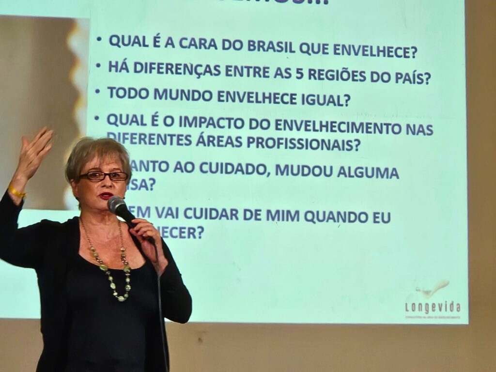 Pensar sobre o envelhecimento em nosso país, afirma a palestrante, é preciso considerar as diferenças entre as cinco regiões brasileiras e seu impacto nas diferentes áreas profissionais e uma questão importante: “quem vai cuidar de mim quando eu envelhecer?”.
