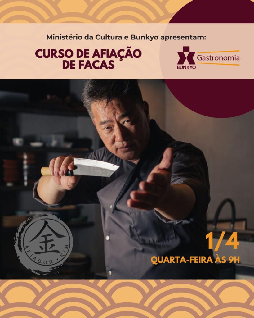 A comissão de gastronomia japonesa promove o próximo curso com o afiador KIM, no dia 1 de abril (quarta-feira), das 9h às 12h, ensinando fundamentos da afiação das facas de cozinha, apresentando os tipos de facas essenciais utilizados pelo(a) cozinheiro(a), técnicas de corte, afiação com pedras de afiar e amolar e manutenção do fio de corte: