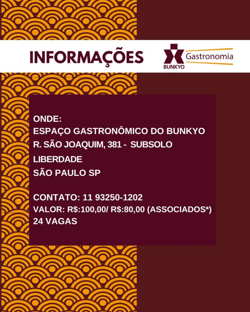 Aula presencial (totalmente em português), no Espaço Gastronômico do Bunkyo – R. São Joaquim, 381, Liberdade/SP.