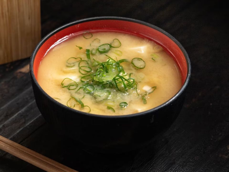- Missoshiru (sopa de pasta de soja) com somen (macarrão fino), tomate e Aburaague (tofu frito)