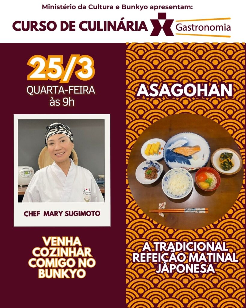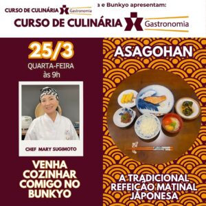A comissão de gastronomia japonesa promove o próximo curso com a chef Mary Sugimoto, no dia 25 de março (quarta-feira), das 9h às 12h, ensinando receitas deliciosas da culinária japonesa: