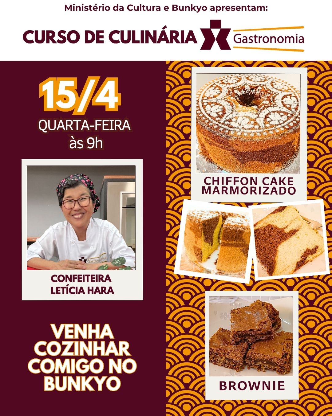 A comissão de gastronomia japonesa promove o próximo curso com a confeiteira Letícia Hara, no dia 15 de abril (quarta-feira), das 9h às 12h, ensinando receitas especiais da confeitaria.
