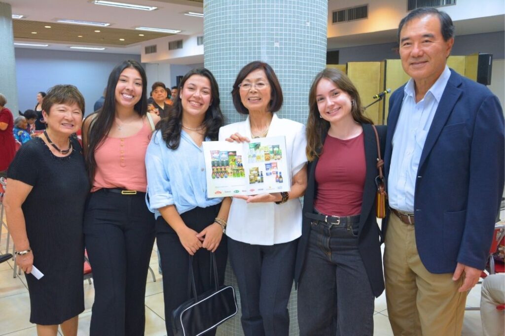 Da esq. para dir., Teruco Kamitsuji, Karol e Bia da Sakura Nakaya Alimentos, Marlene Fukushima, Vitoria de Paula da Sakura e vice-presidente do Bunkyo Carlos Harasawa