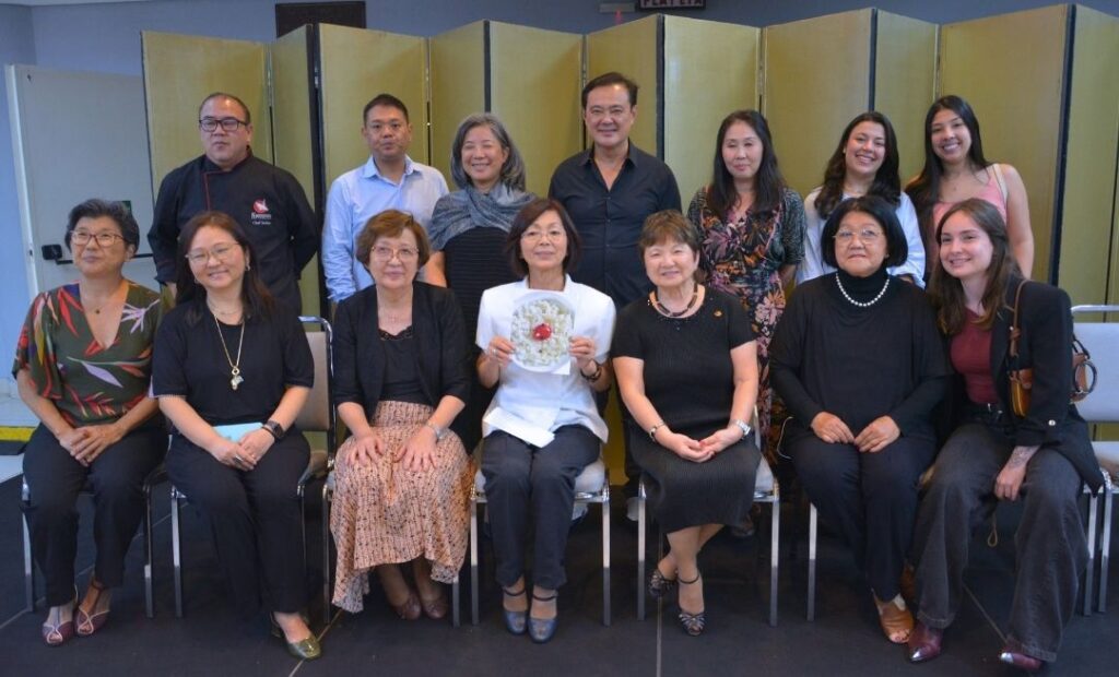 Autoridades, patrocinadores e chefs: sentados, da esq. para dir., Vitoria de Paula (Sakura Nakaya Alimentos), chefs Letícia Hara, Alice Hirayama, Marlene Fukushima, Suehiro Kuwazuru, Elisa Kanashiro, Márcia Miyazaki, Cristiane Sampei e Bernadete Kambe. Em pé, da esq. para dir., Tomio Katsuragawa (representante do ex-vereador Aurélio Nomura), cônsul-geral-adjunto Jiro Takamatsu, representante-chefe da JICA Akihiro Miyasakis, presidente da Japan House São Paulo Carlos Augusto Roza, chef Anderson Shimabukuro, presidente Roberto Yoshihiro Nishio, chef e cantor Joe Hirata, presidente da Fundação Kunito Miyasaka Teodoro Sato, presidente de honra do Bunkyo Renato Ishikawa, vereador Kenji Ito e vice-presidente Carlos Kendi Fukuhara