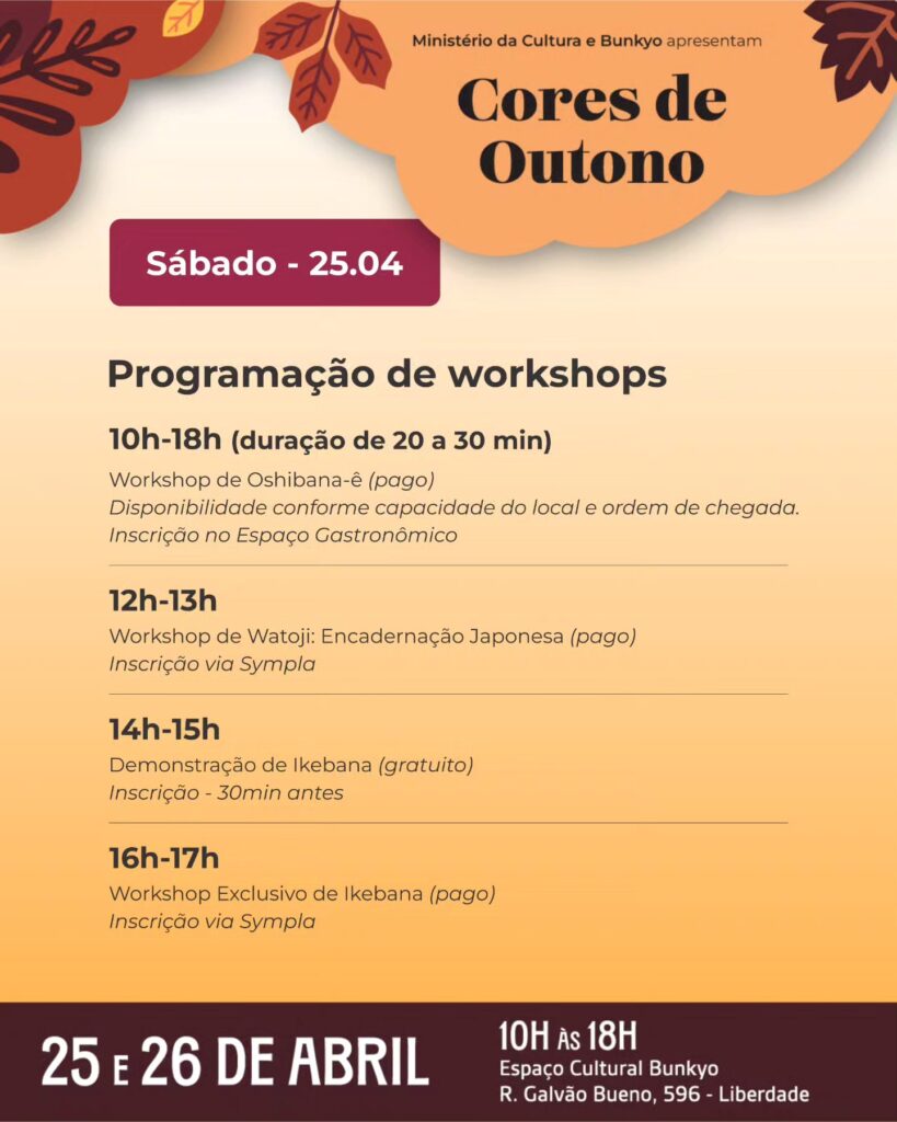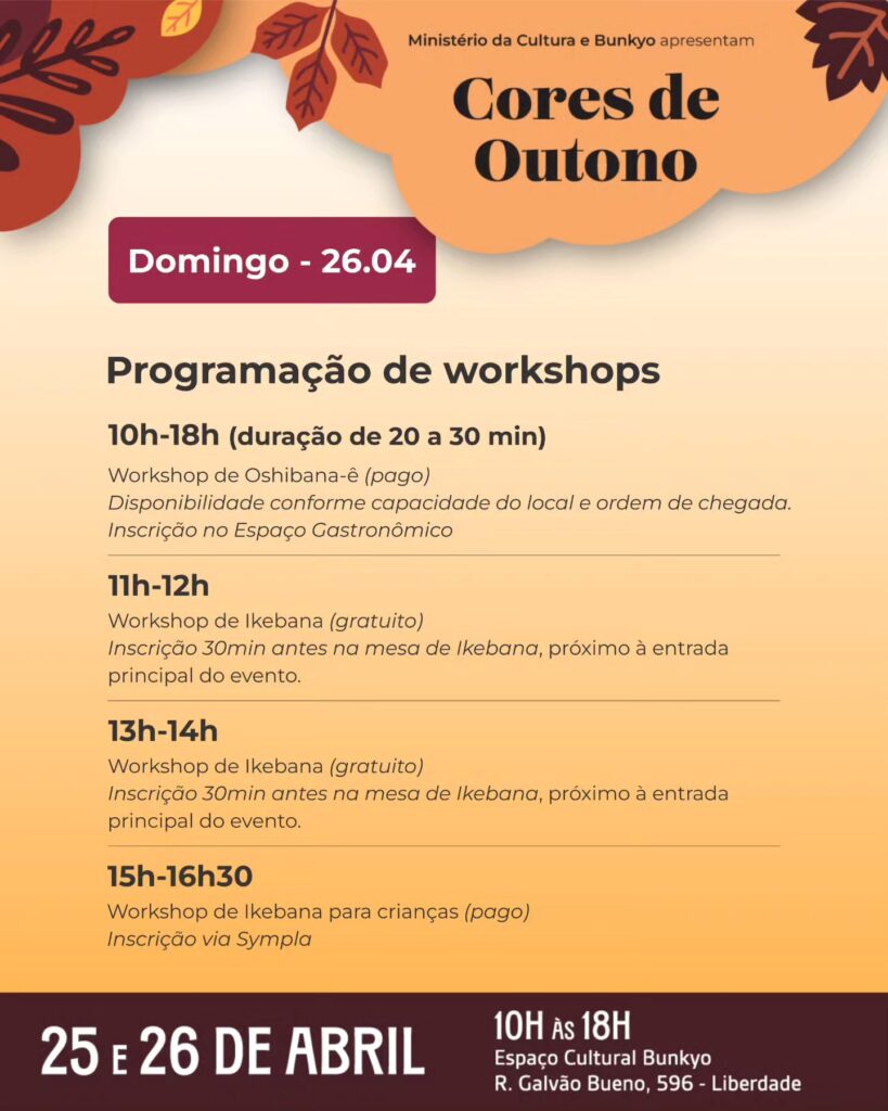 Nos próximos dias 25 e 26 de abril, no Espaço Cultural Bunkyo, acontece o “Cores de Outono – Feira Koguei e Exposição de Ikebana“, um encontro imperdível reunindo duas artes tradicionais japonesas, envolvendo exposição, workshop, feira e gastronomia.