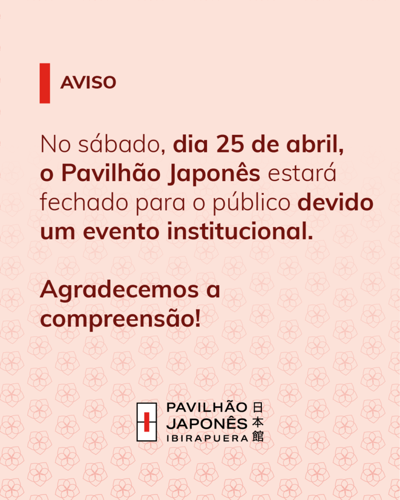 Informamos que excepcionalmente, no dia 25 de abril de 2026 (sábado), o Pavilhão Japonês, localizado no Parque Ibirapuera em São Paulo, estará fechado para o público para realização de um evento institucional restrito a convidados.