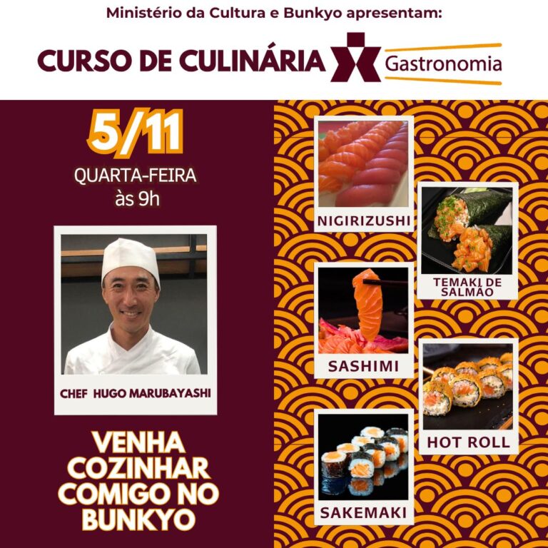 A comissão de gastronomia japonesa promove o próximo curso com o chef Hugo Marubayashi, no dia 5 de novembro (quarta-feira), das 9h às 12h, ensinando