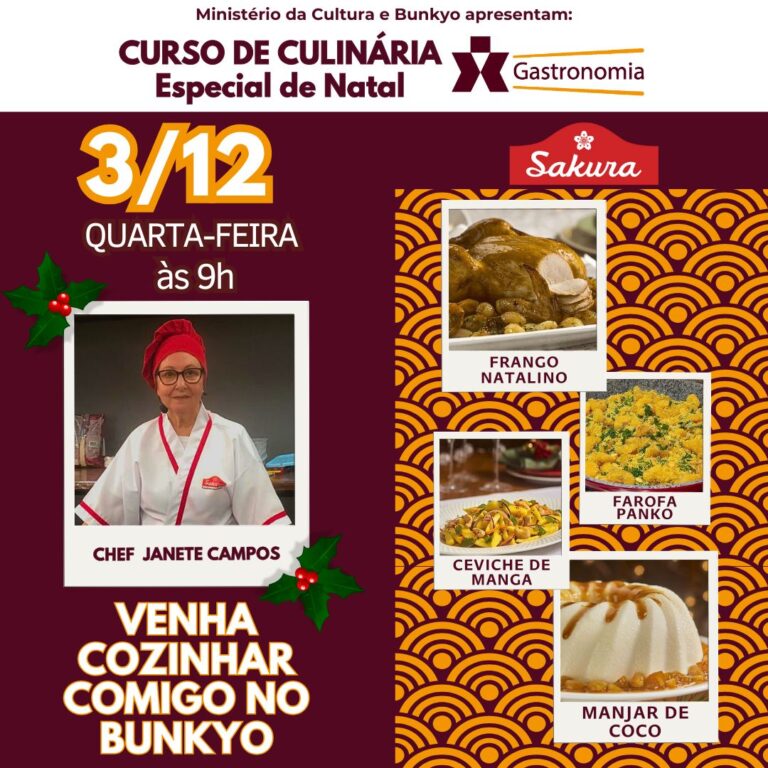 Com oferecimento da Sakura Alimentos para a Gastronomia do Bunkyo a chef Janete Campos, no dia 3 de dezembro (quarta-feira), das 9h às 12h irá preparar um menu especial de natal: Aula presencial (totalmente em português), no Espaço Gastronômico do Bunkyo. Valor : R$:100,00 / R$:80,00 (associados*), 35 vagas.Com degustação