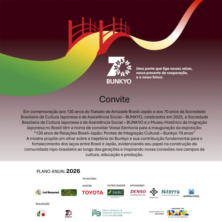 A Sociedade Brasileira de Cultura Japonesa e de Assistência Social – Bunkyo realiza a abertura da exposição “70 Anos Bunkyo”, que celebra sete décadas de atuação na preservação, promoção e difusão da cultura japonesa no Brasil, promovendo o relacionamento entre associações culturais nipo-brasileiras de todo o Brasil e representando esta