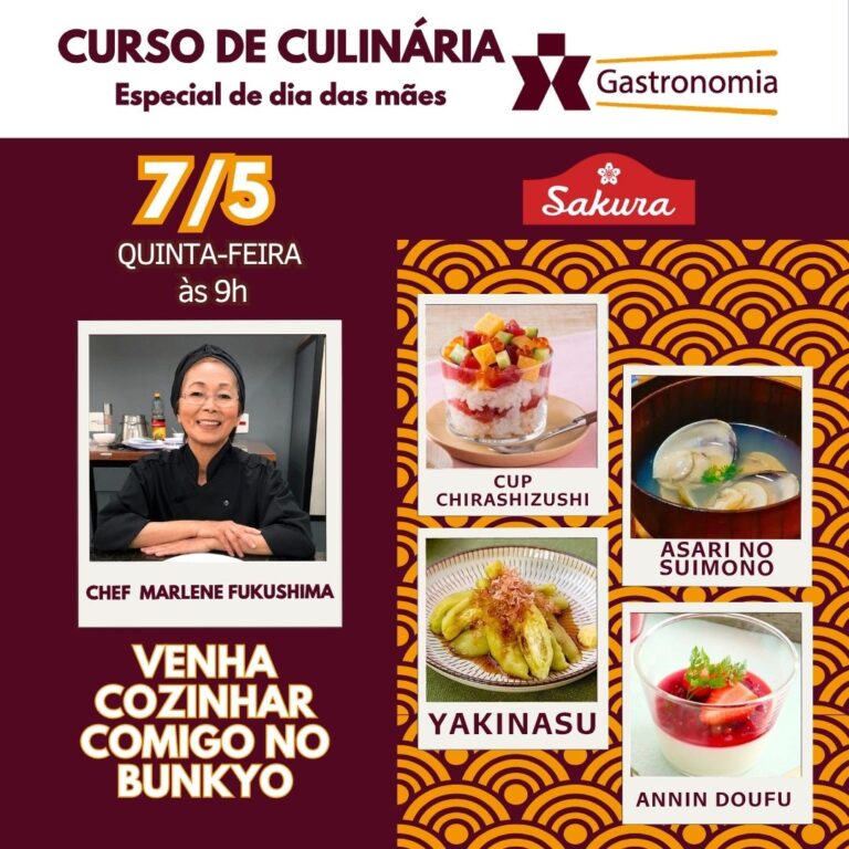 Com oferecimento da Sakura Alimentos para a Gastronomia do Bunkyo a chef Marlene Fukushima, no dia 7 de maio (quinta-feira), das 9h às 12h irá preparar um menu especial de dia das mães: • Cup Chirashizushi (base de arroz coberto com fatias de sashimi, vegetais e ovos no copinho)• Yakinasu (beringela