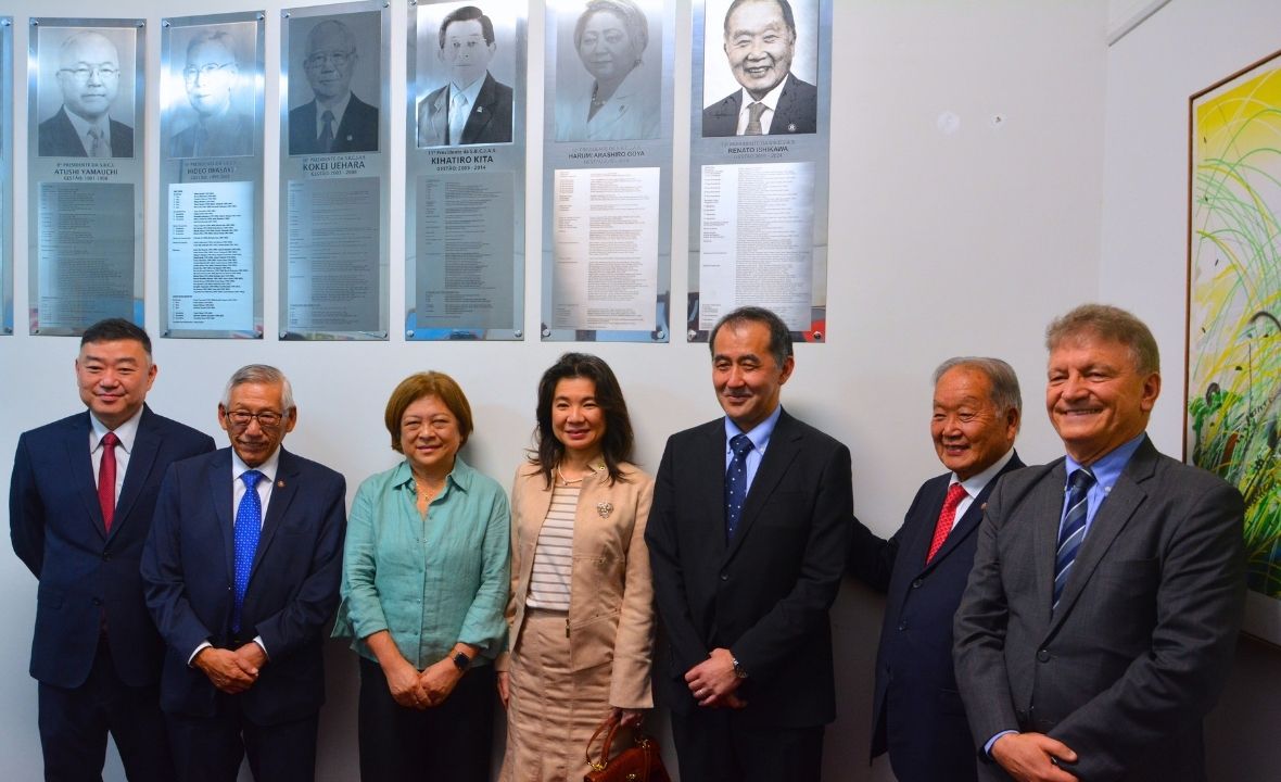 写真左から:平野副会長西尾会長石田オルガ夫人鈴木在聖総領事野口在駐大使石川レナト名誉会長a esq. para dir: vice-presidente Oston Hirano, presidente Roberto Yoshihiro Nisho, Olga Ishida, cônsul-geral Yoriko Suzuki, embaixador do Japão Yasushi Noguchi, presidente de honra Renato Ishikawa, cônsul-geral do Brasil Aldemo Garcia