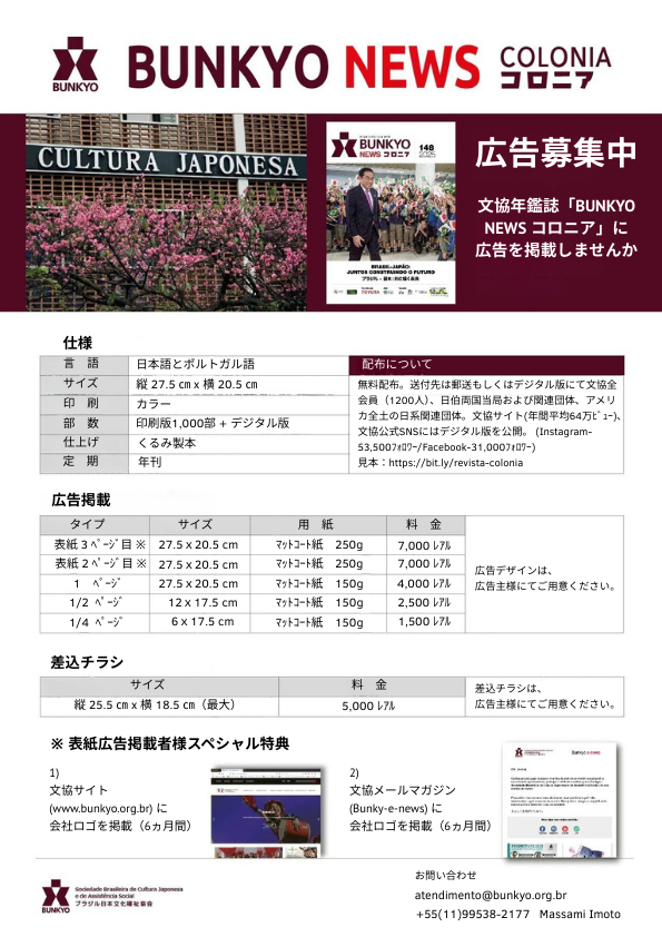 文協の活動を綴る年鑑誌「BUNKYO NEWS コロニア」の第149号の作成準備を始めており、現在、同誌への広告掲載を募集しています。